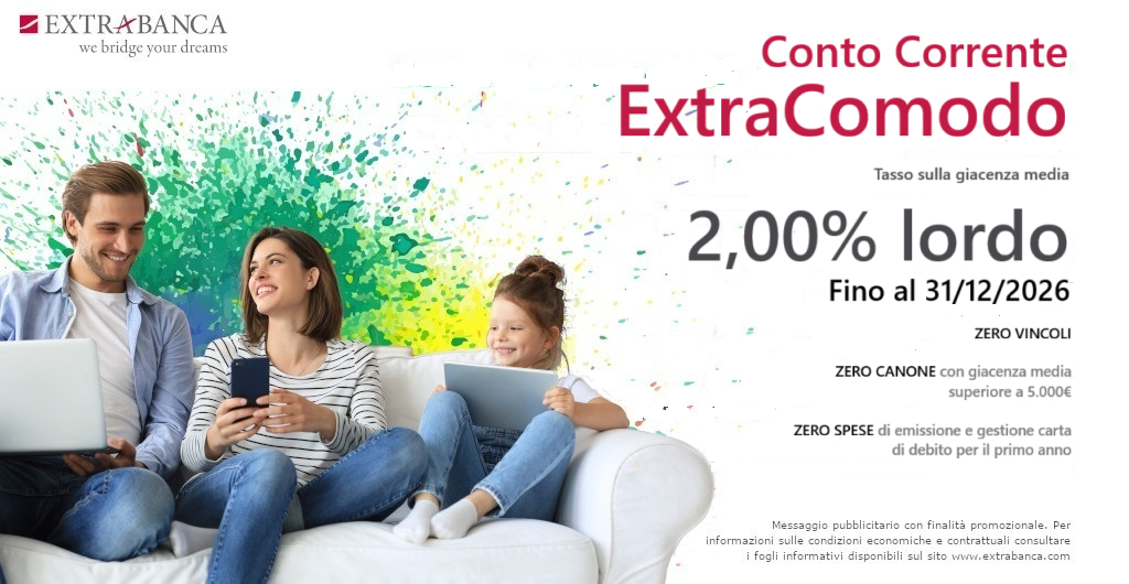 Extracomodo è il conto corrente online di Extrabanca. Ti offre un tasso sulla giacenza media del 2,00% lordo fino al 31/12/2026.