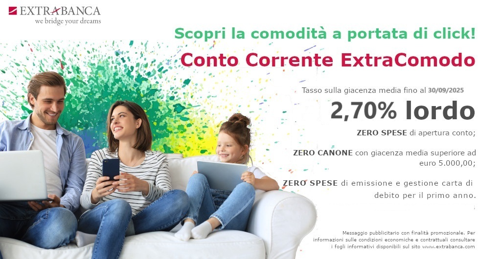 Extracomodo è il conto corrente online di Extrabanca. Ti offre un tasso sulla giacenza media del 2,00% lordo fino al 31/12/2026.