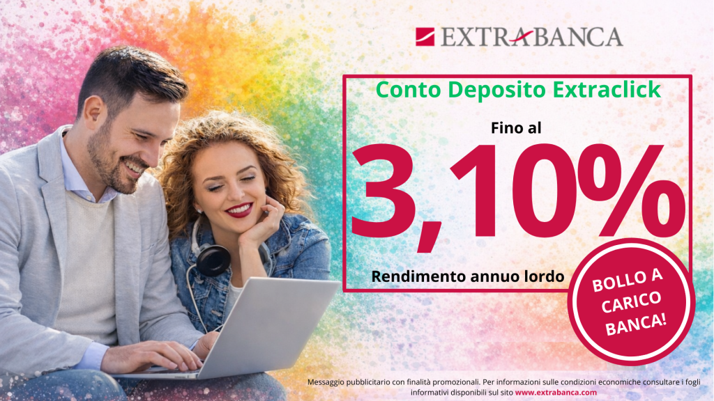 Extraclick è il conto di deposito online di Extrabanca. La migliore soluzione per gestire in tutta semplicità i tuoi risparmi per farli fruttare al meglio con tassi di interesse Extraordinari. Puoi ottenere un interesse fino al 3,00% annuo lordo per vincoli di 24 mesi e se hai bisogno di svincolare le tue somme anticipatamente puoi farlo senza pagare penali.